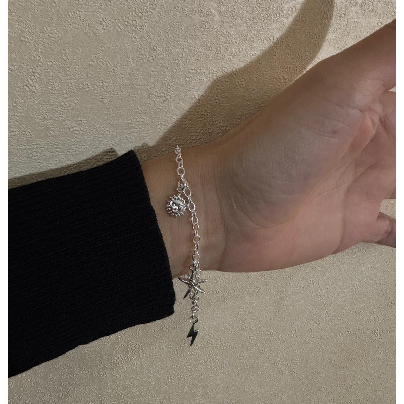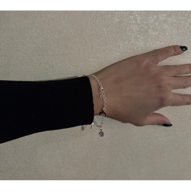 ¡La pulsera "Universo Marino" es la joya perfecta para cualquier mujer amante del océano! Con su elegante diseño de plata que incluye un rayo, una luna, un sol y una estrella de mar, esta pulsera es una maravillosa representación de la belleza y el poder del mar. ¡Lleva contigo un pedacito del océano a donde vayas.